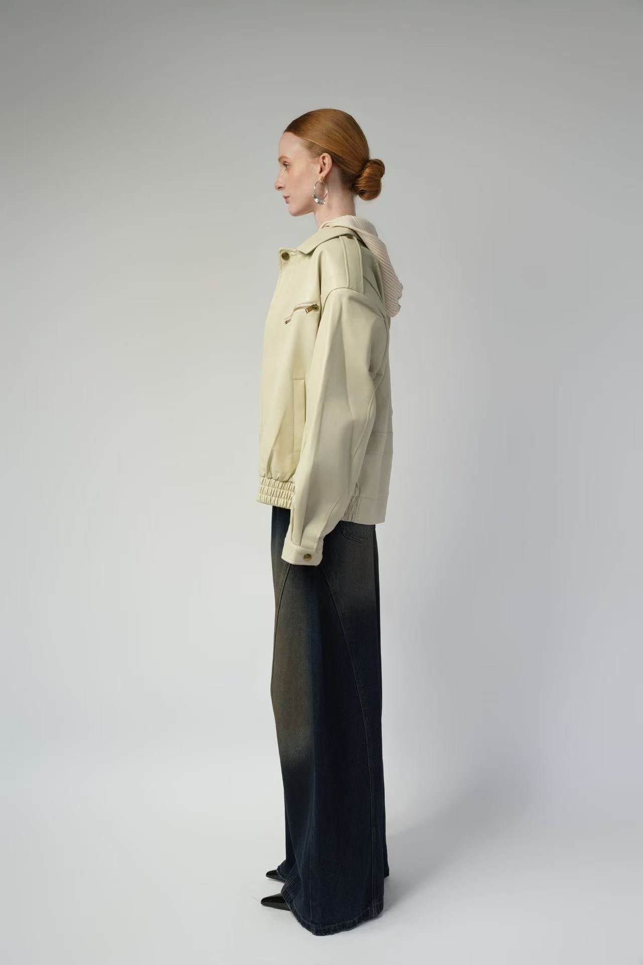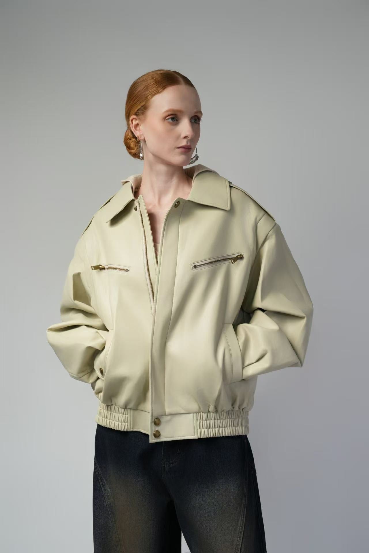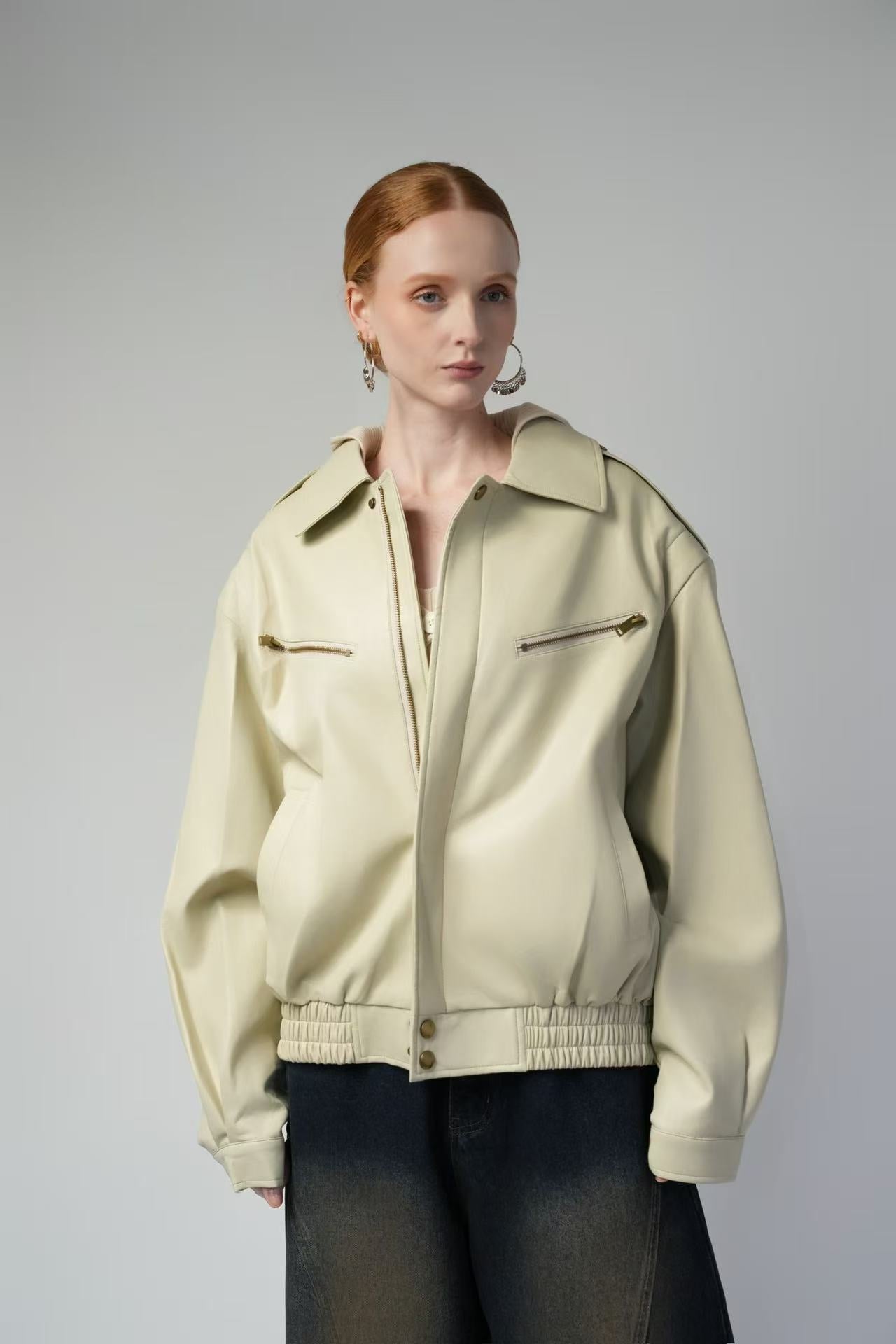 - This contemporary leather jacket combines sleek tailoring with urban functionality. The relaxed notch lapel frames the neckline with subtle ease, while the asymmetric zip-front closure and slim waist definition create a sharp, modern silhouette. Practical side zips and discreet pockets offer everyday convenience.