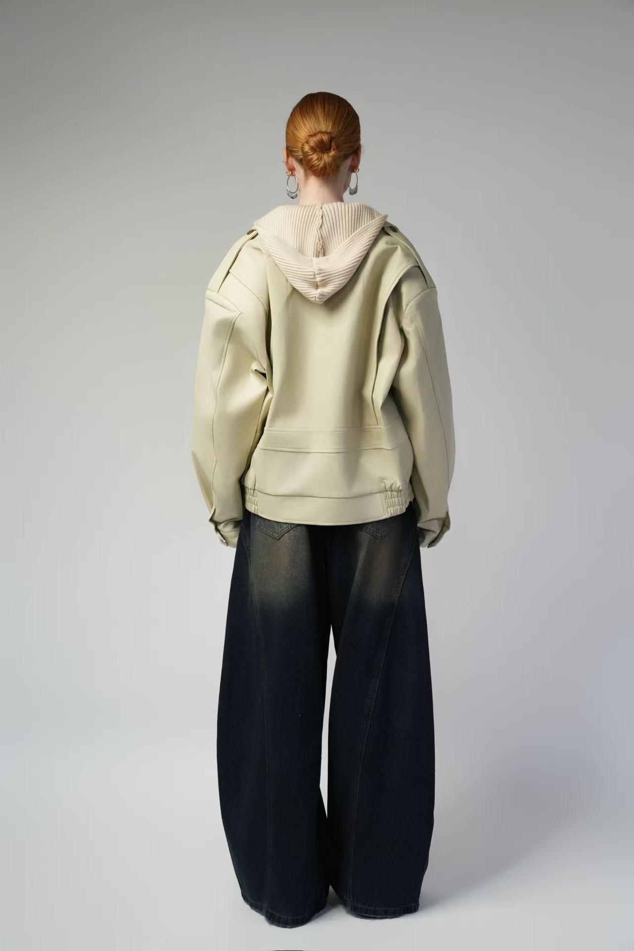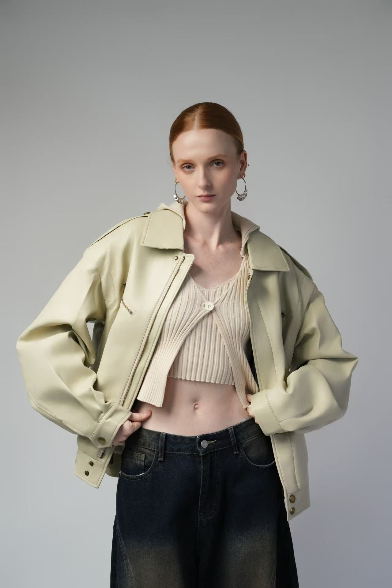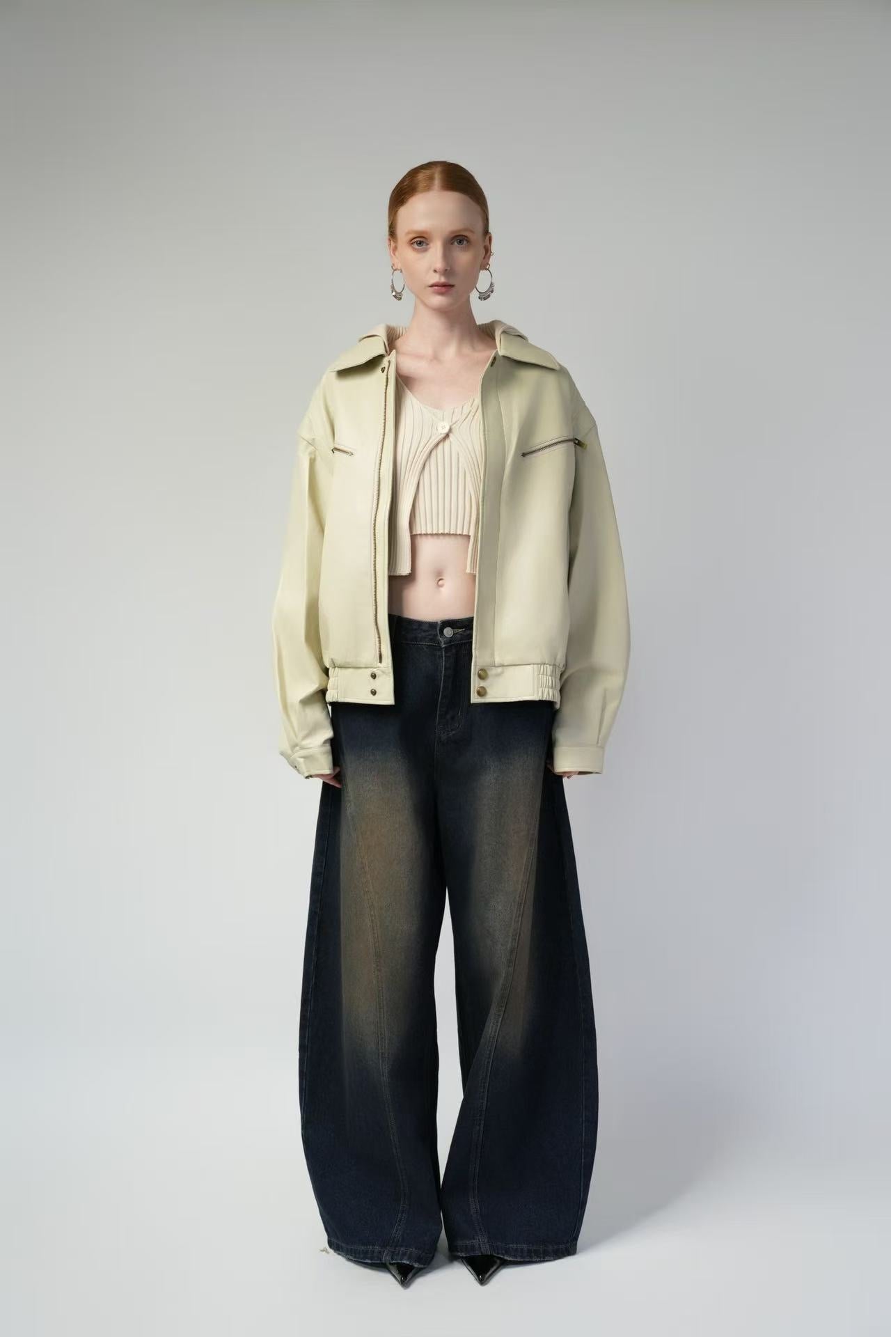 - This contemporary leather jacket combines sleek tailoring with urban functionality. The relaxed notch lapel frames the neckline with subtle ease, while the asymmetric zip-front closure and slim waist definition create a sharp, modern silhouette. Practical side zips and discreet pockets offer everyday convenience.