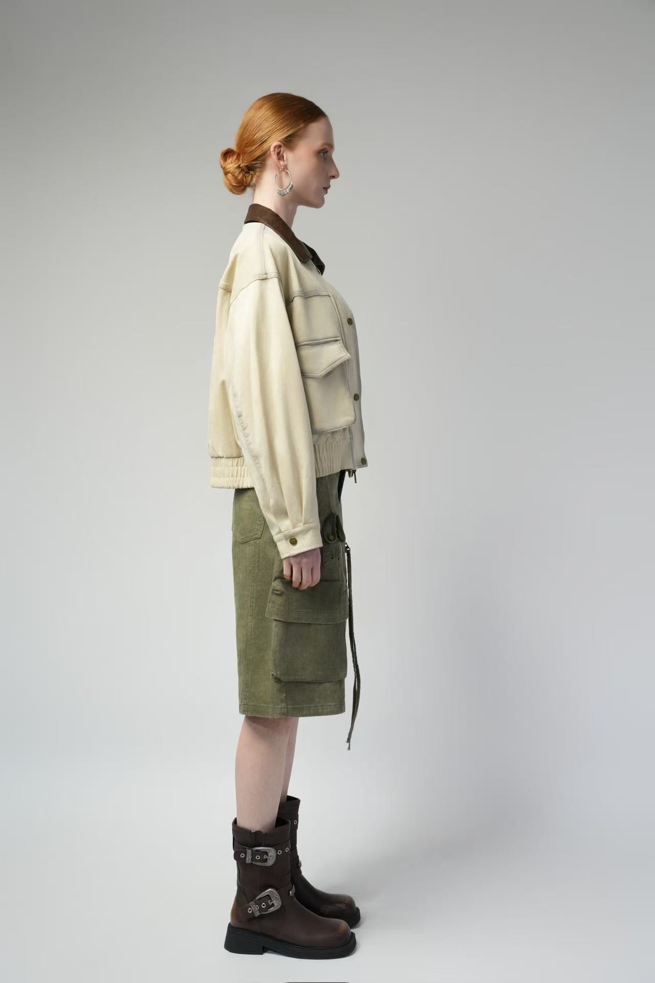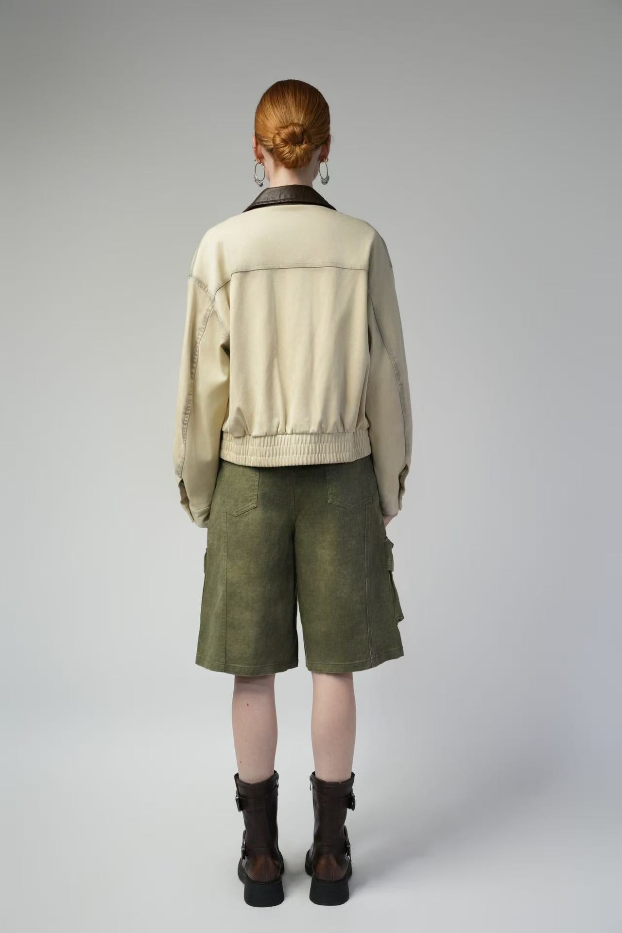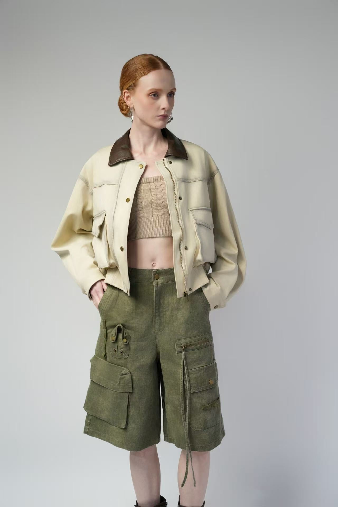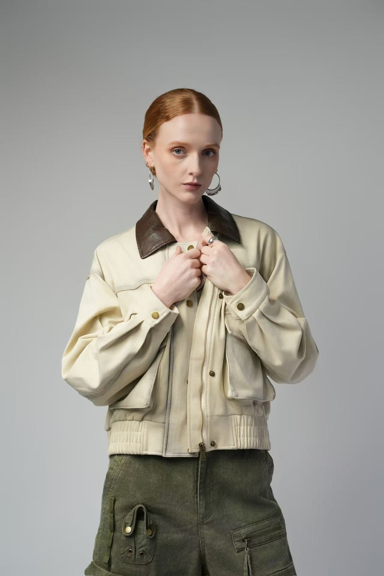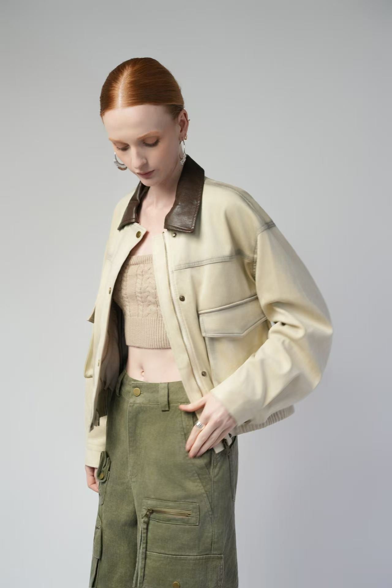 - A modern reinterpretation of classic workwear, this color-block leather jacket blends vintage charm with contemporary edge. The contrast panel construction delivers a retro-modern aesthetic, while the relaxed cropped cut offers a comfortable, urban utility vibe. Designed with a structured collar and functional pockets, it balances style with practicality.