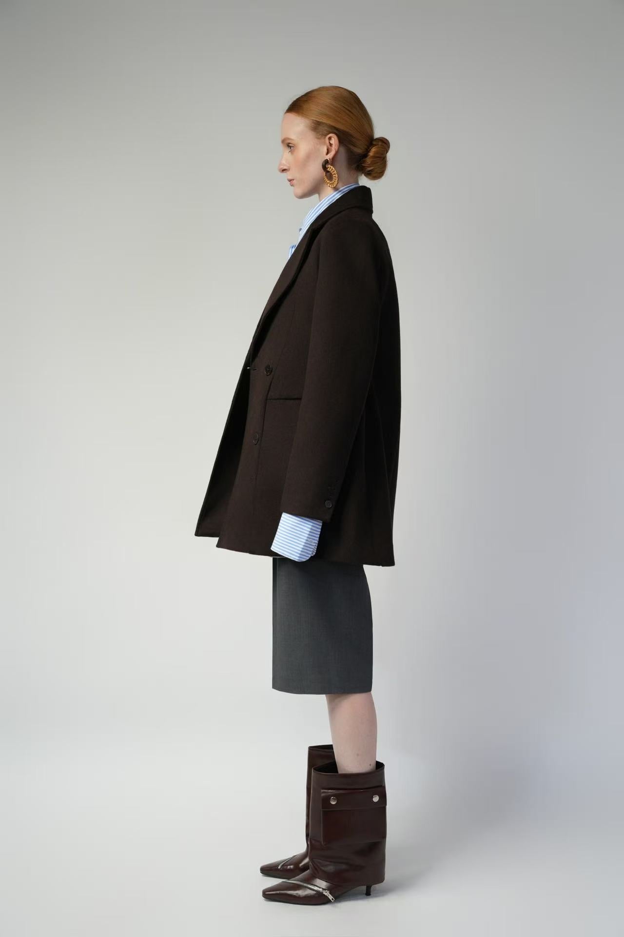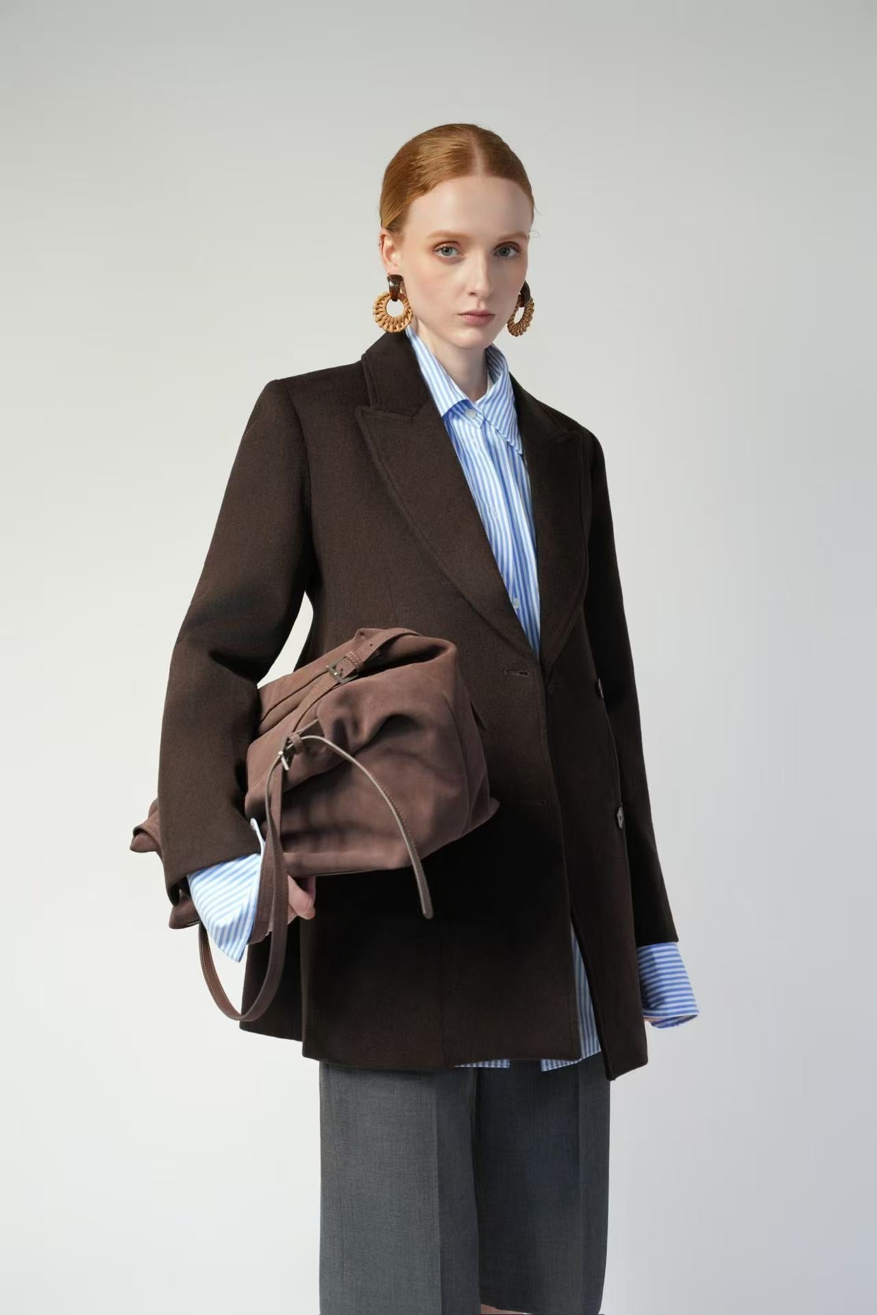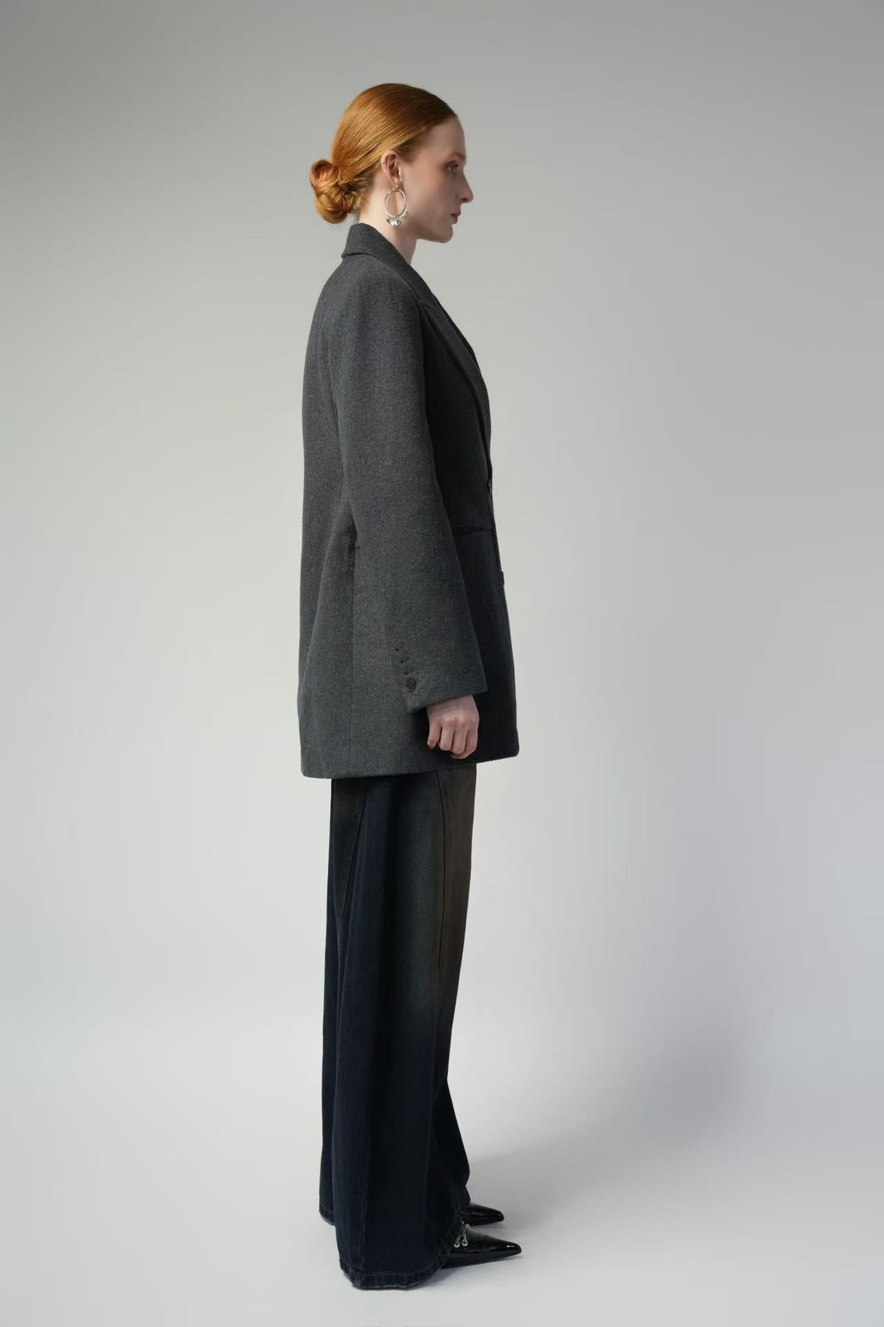 - Featuring sharp shoulder construction that enhances the shoulder-to-head ratio and a sculpted waistline, it creates a streamlined silhouette that exudes confidence and polish. The double-faced wool fabrication offers a subtly textured surface with a refined, pebbled finish.