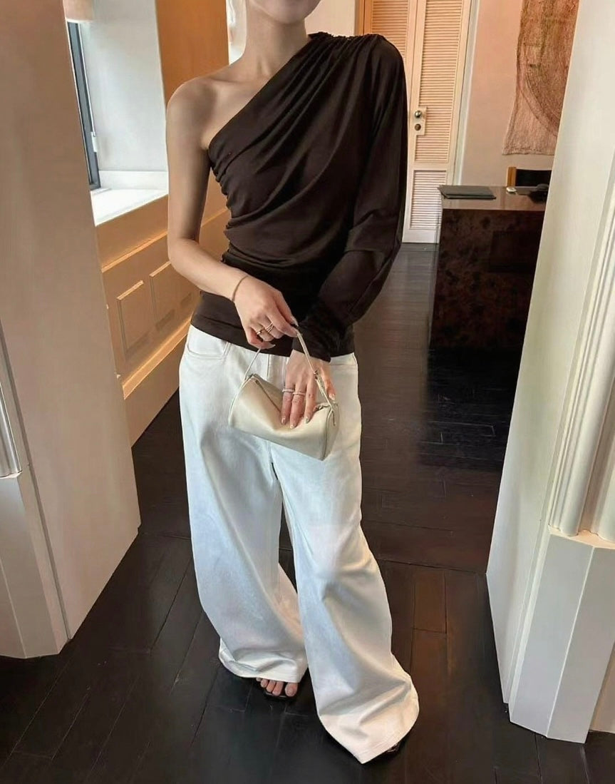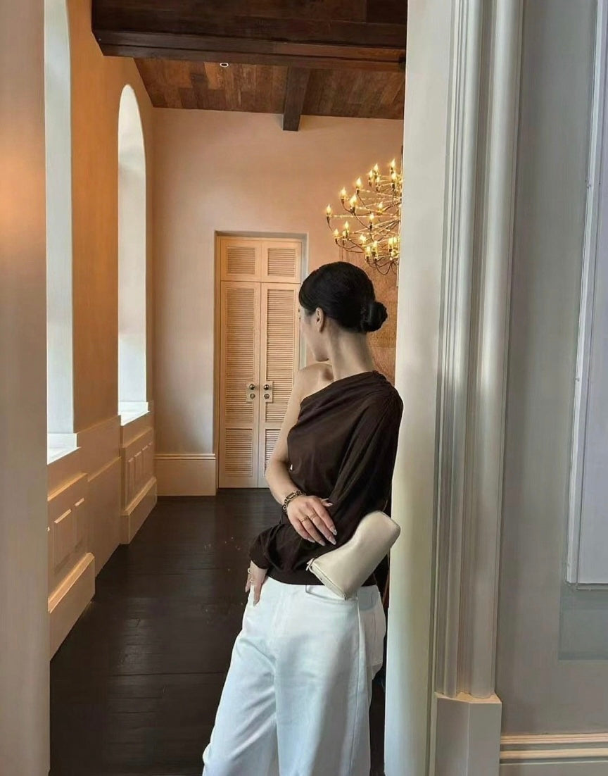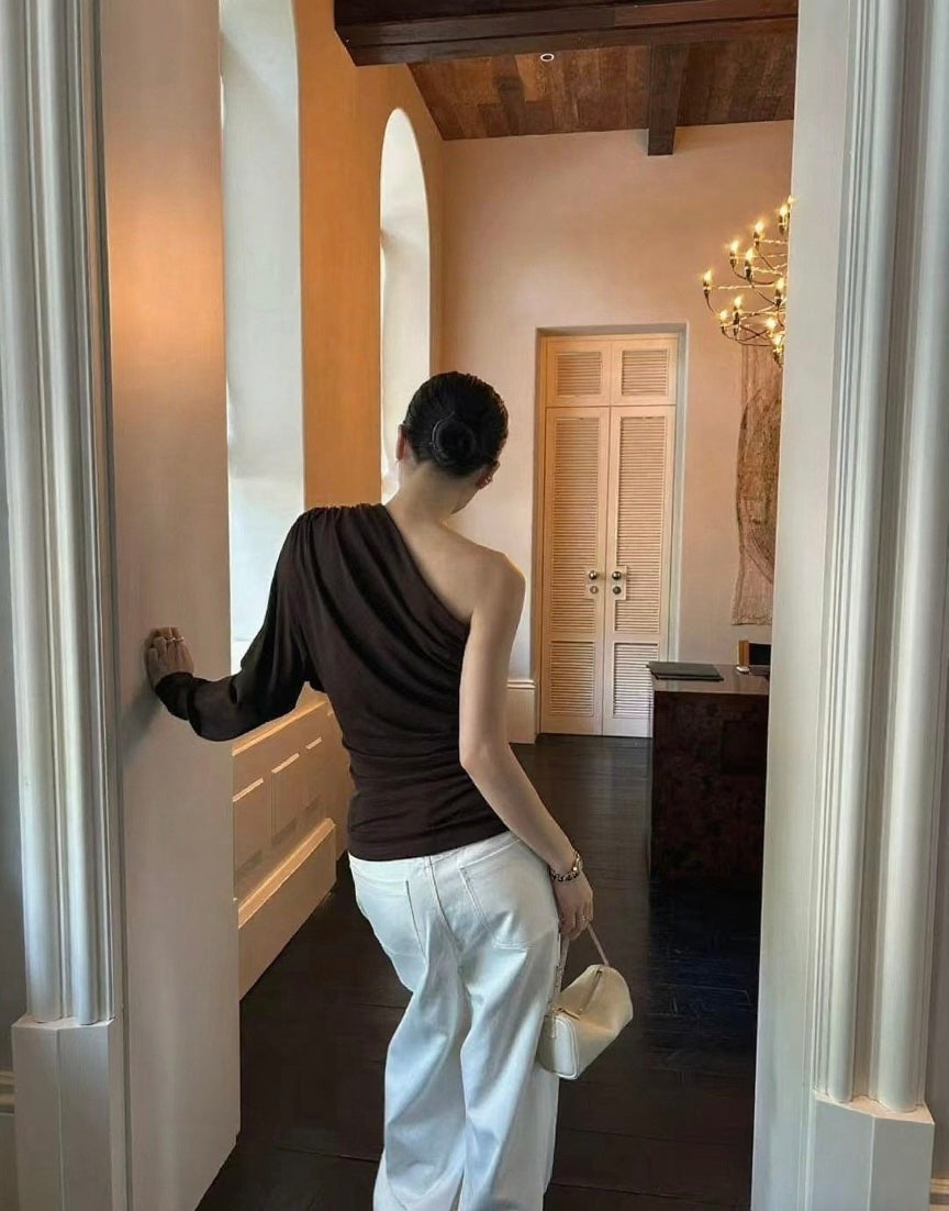 The asymmetric neckline slips elegantly off one shoulder, creating a diagonal line that follows the natural slope of the collarbone. The one-sleeve design adds sculptural impact without compromising wearability. Relaxed but intentional silhouette.