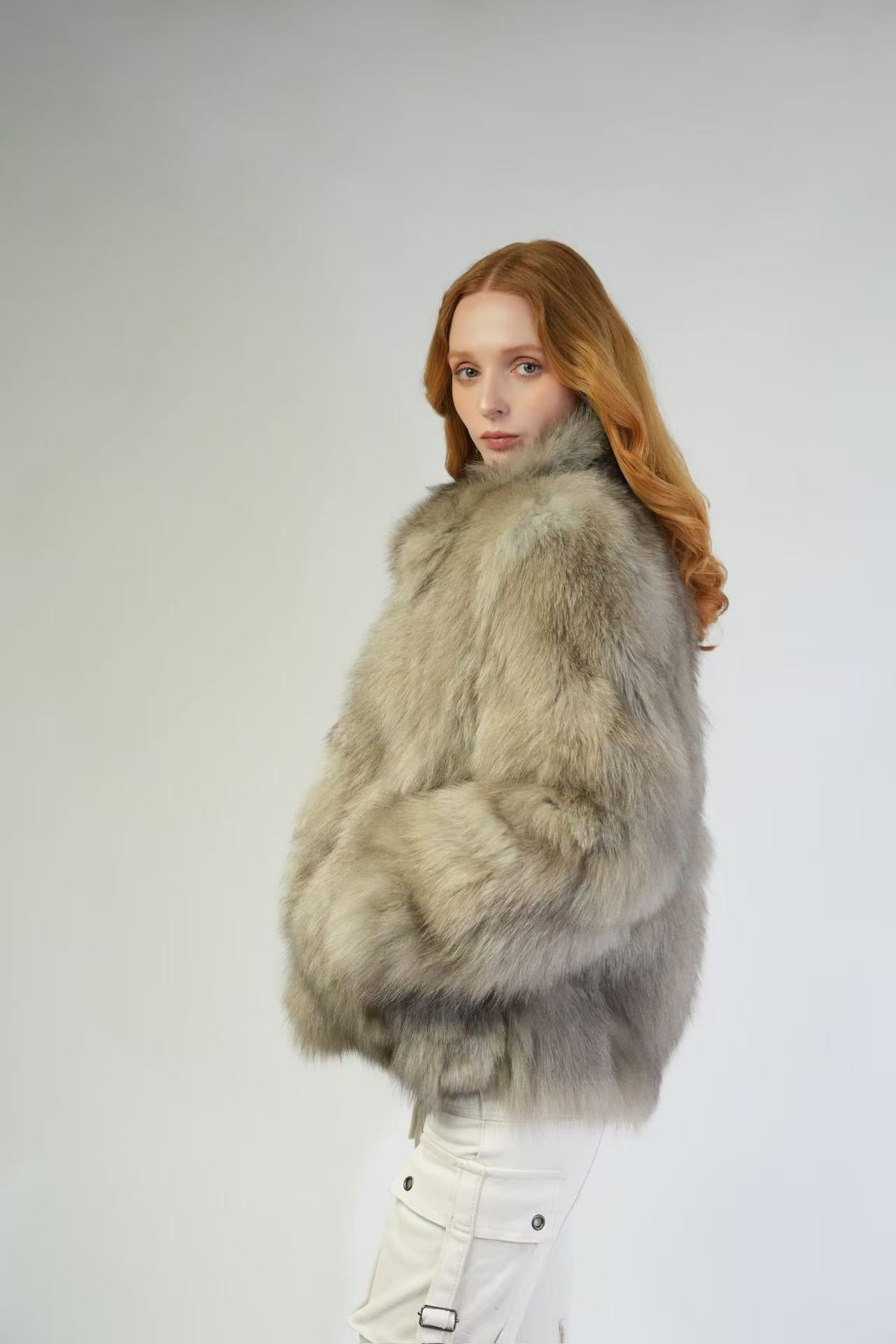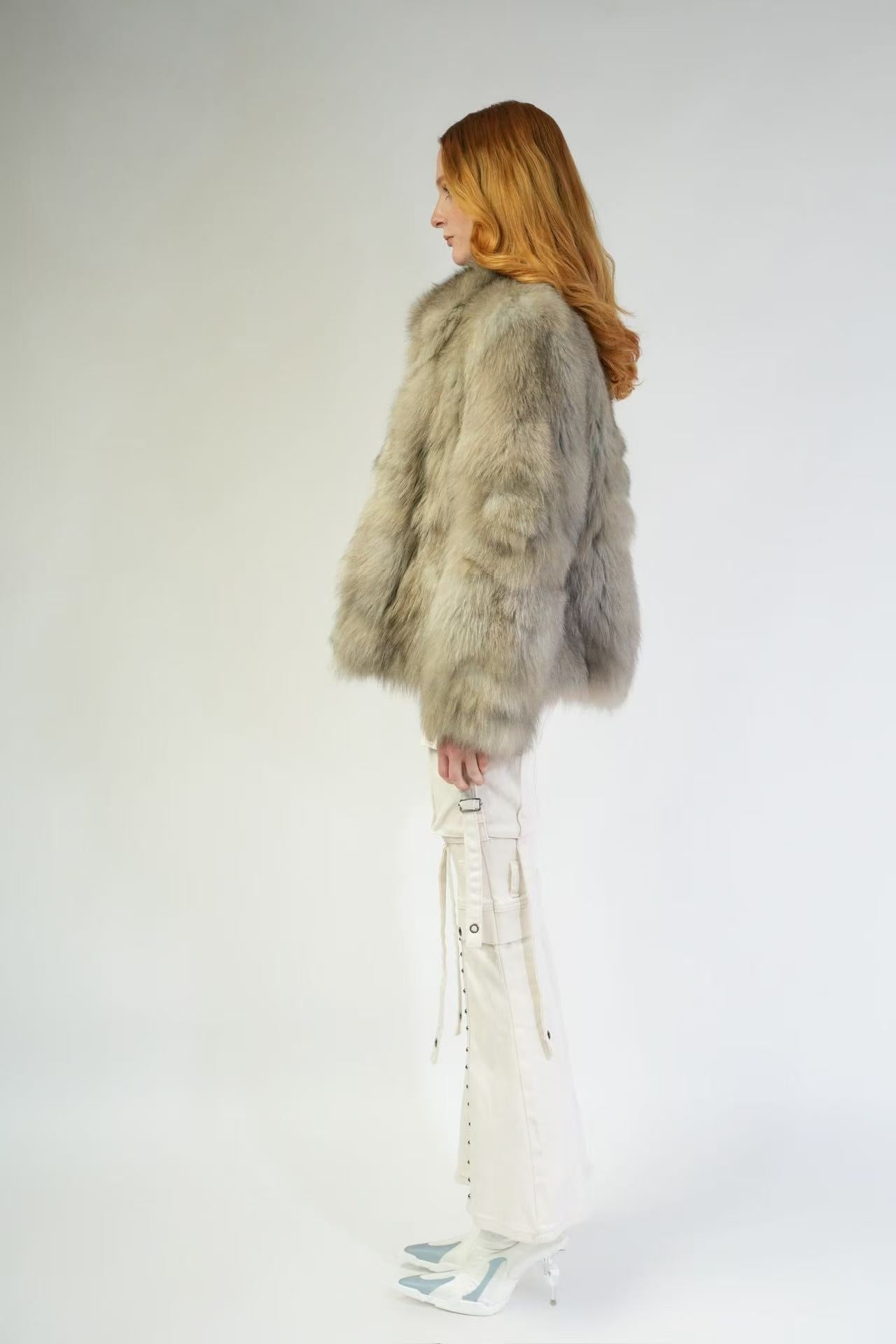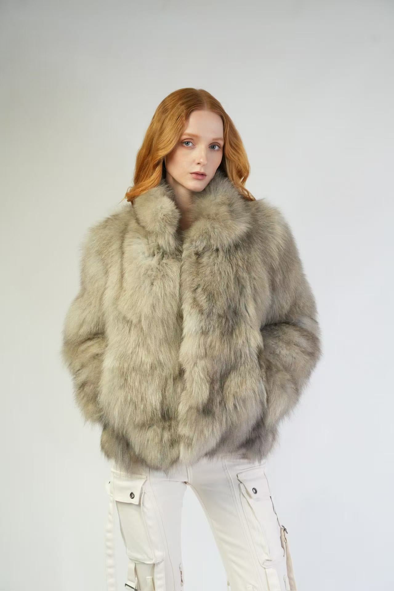 - Crafted from 100% Saga-certified silver fox fur. Tailored with a sculpted stand-collar that frames the face and elongates the silhouette, this piece offers a powerful yet graceful presence.