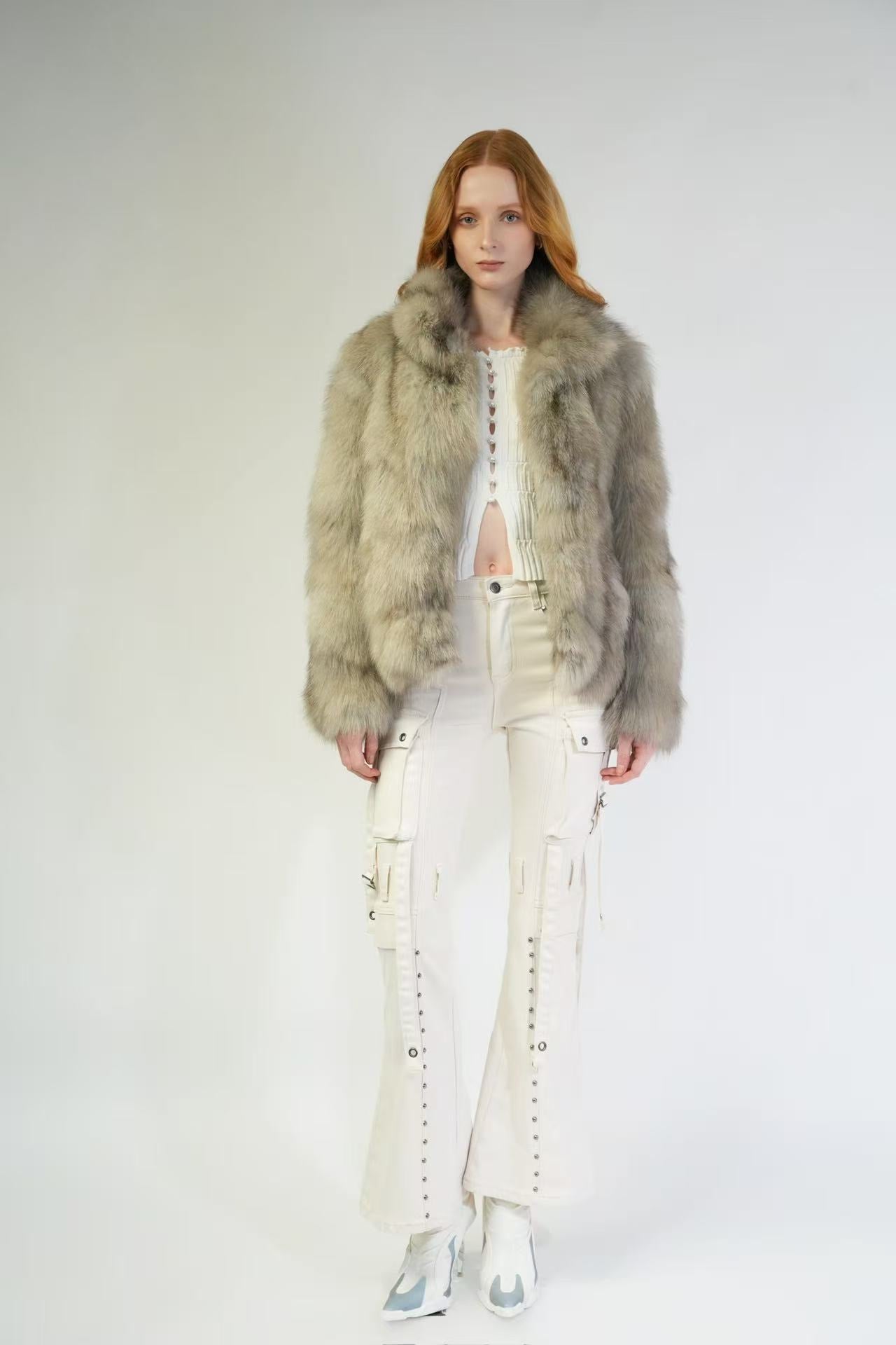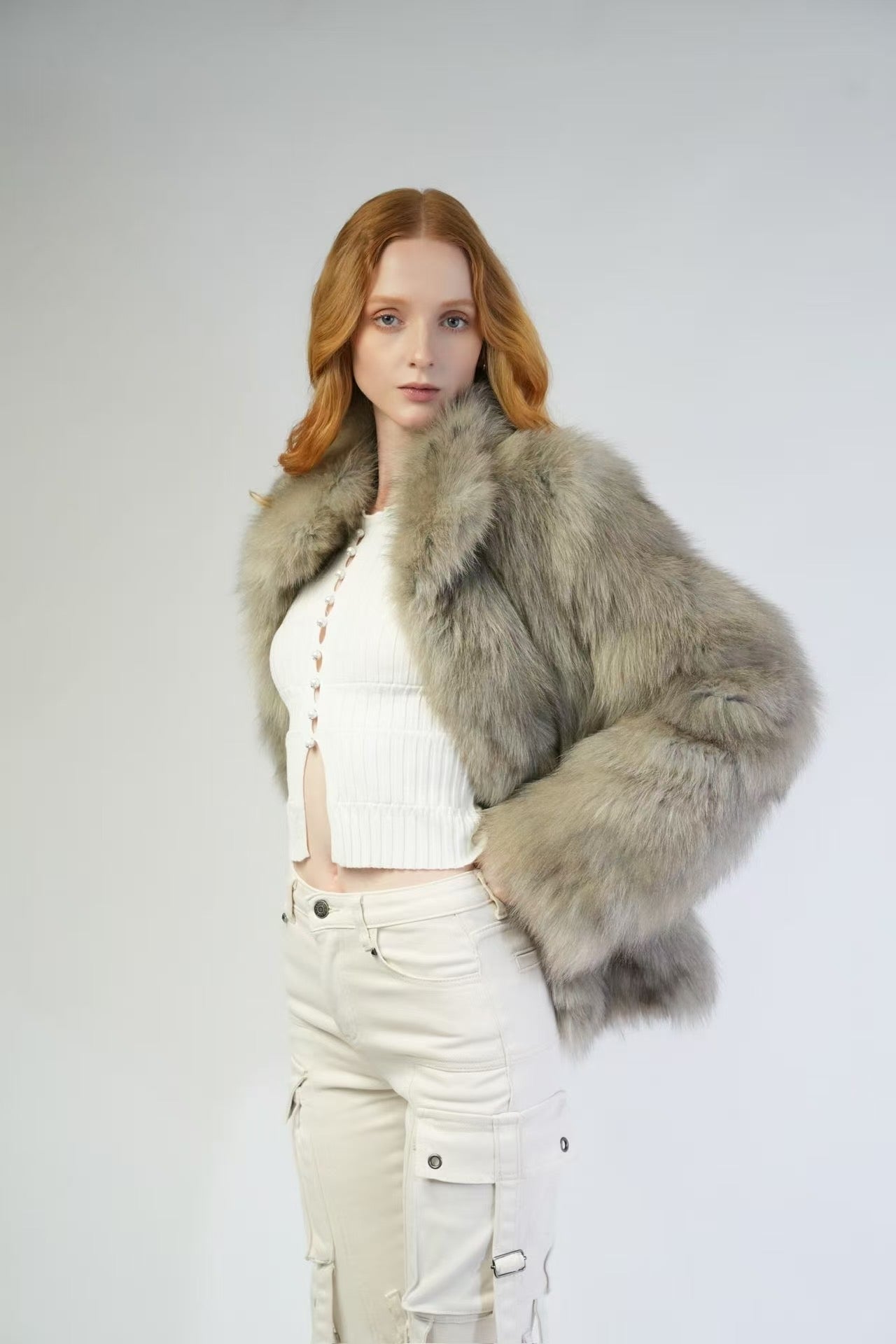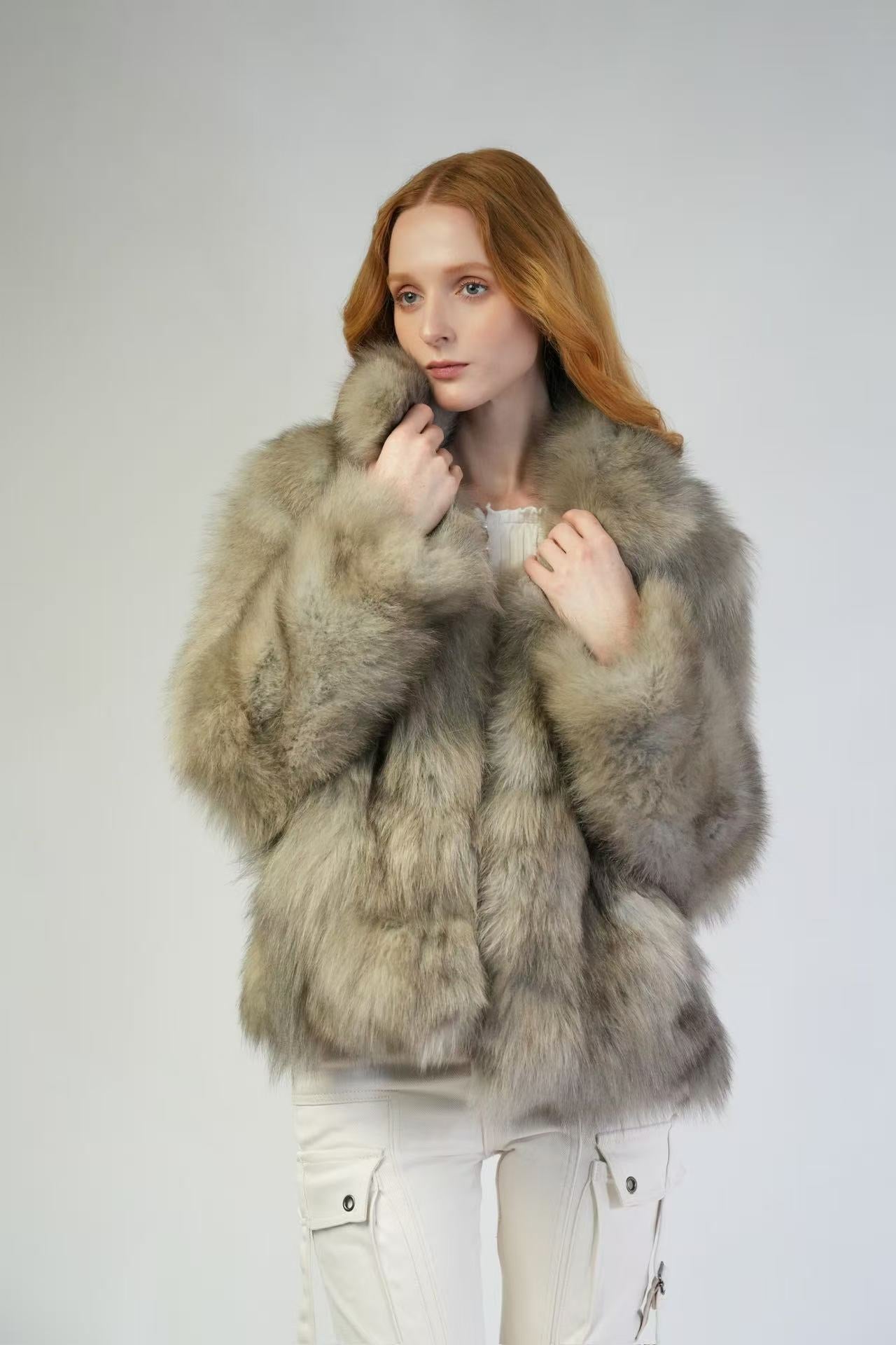 - Crafted from 100% Saga-certified silver fox fur. Tailored with a sculpted stand-collar that frames the face and elongates the silhouette, this piece offers a powerful yet graceful presence.