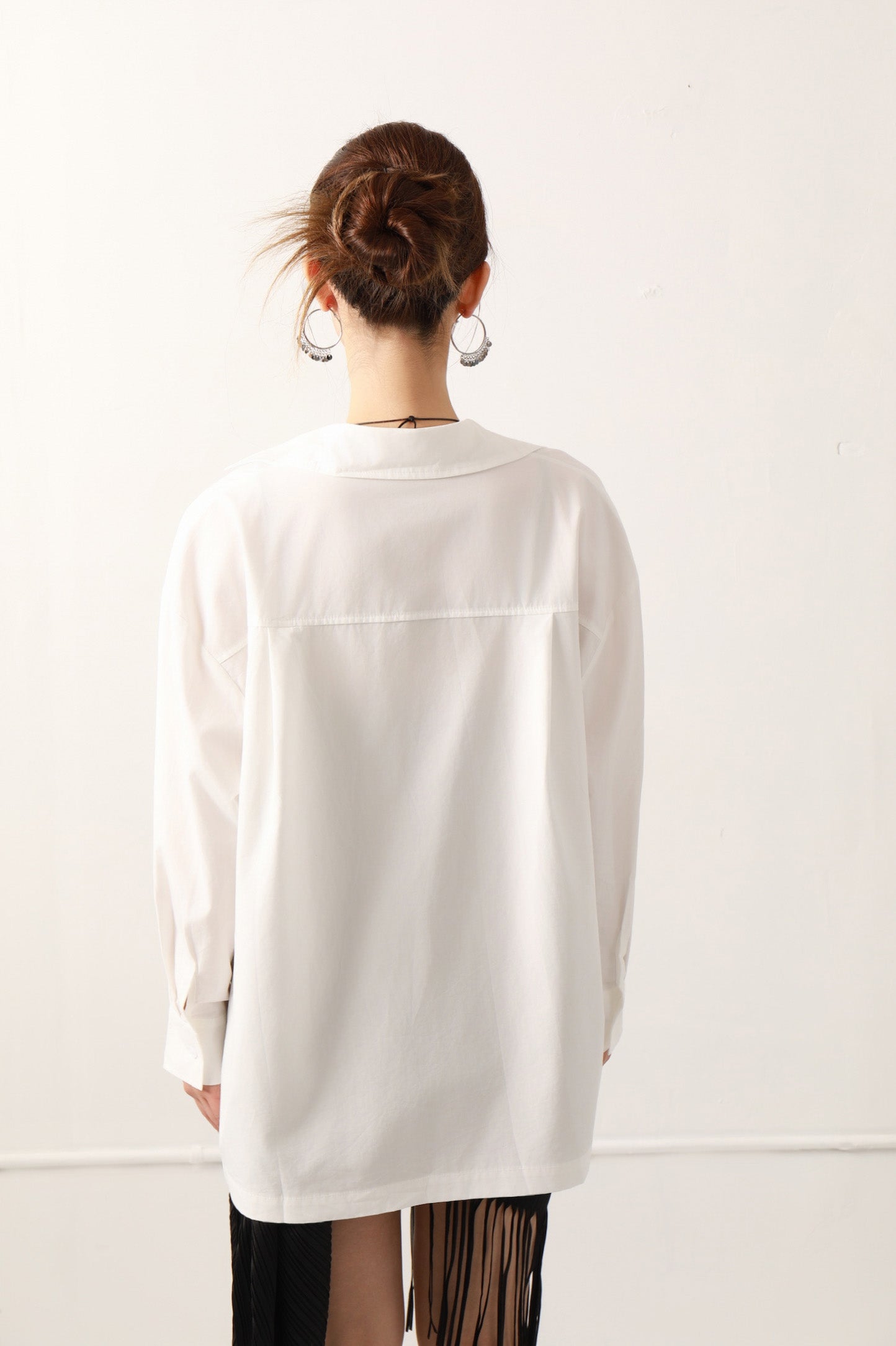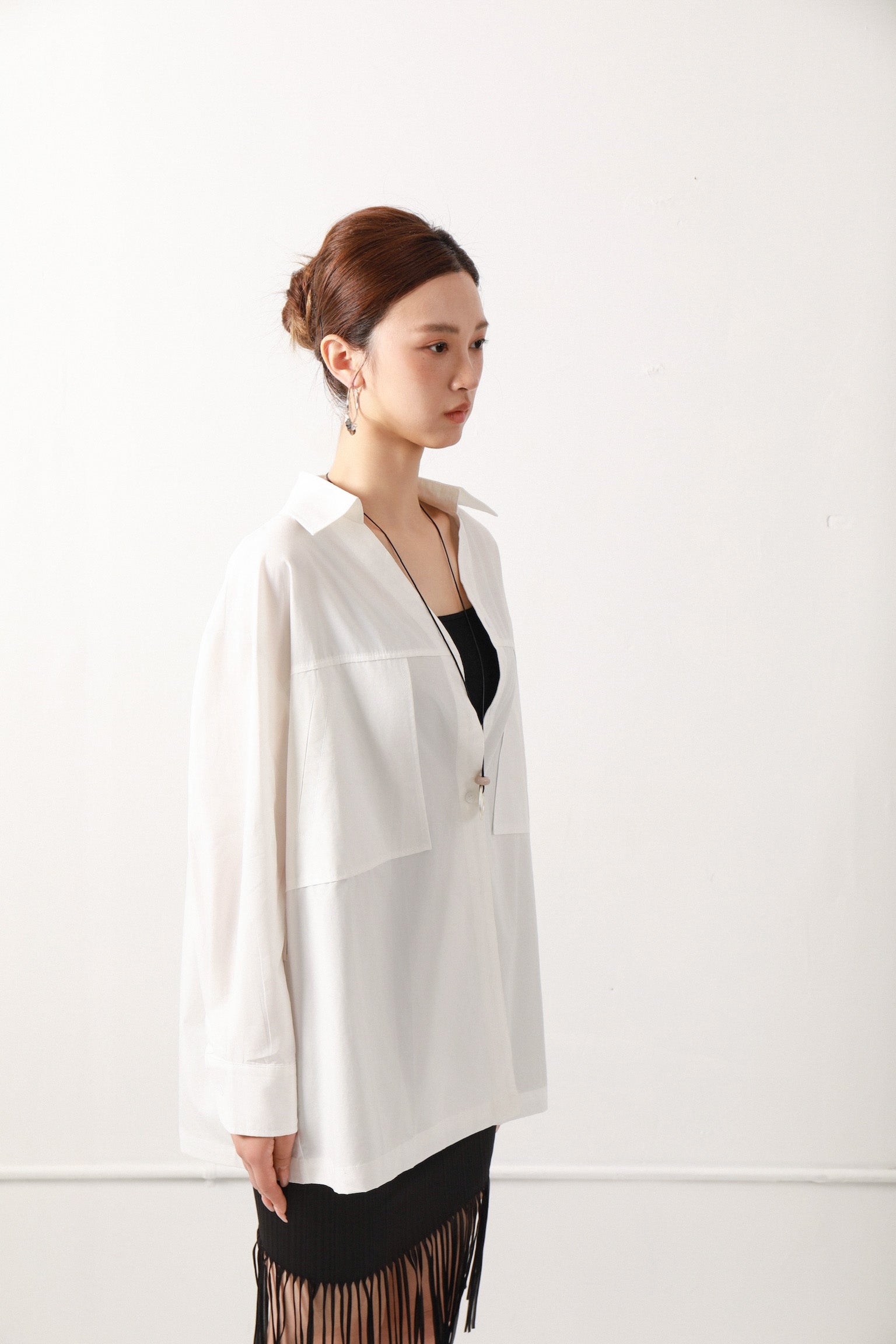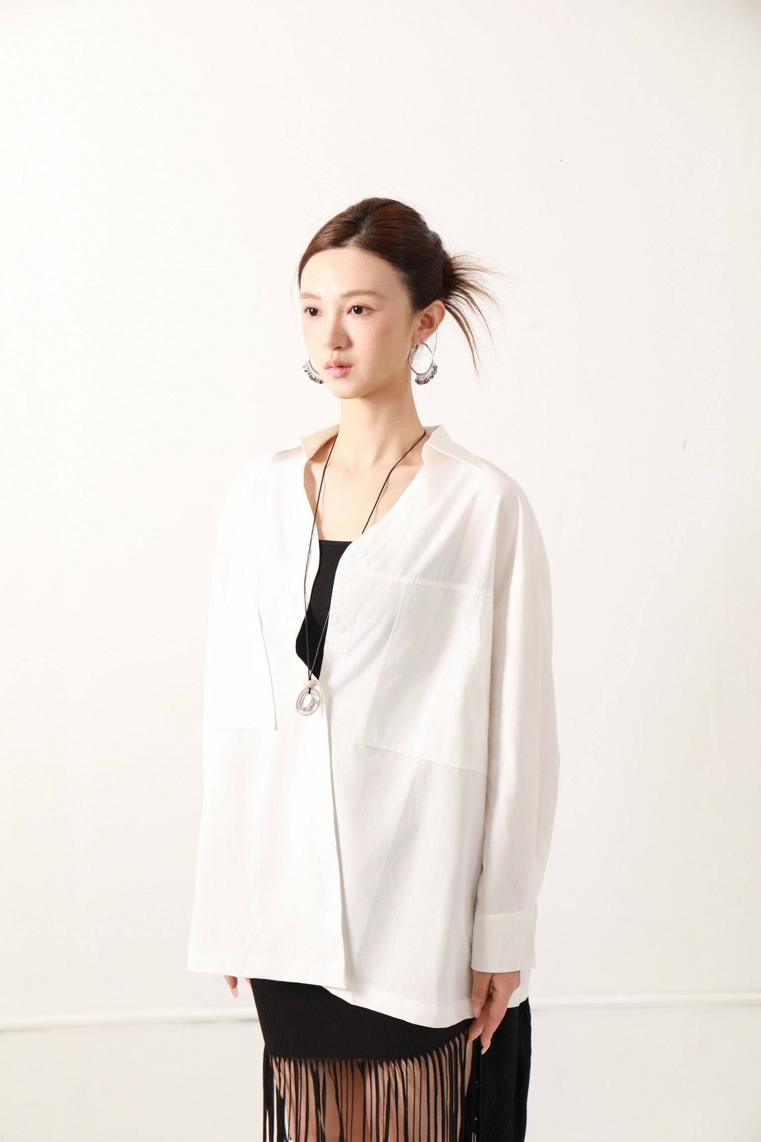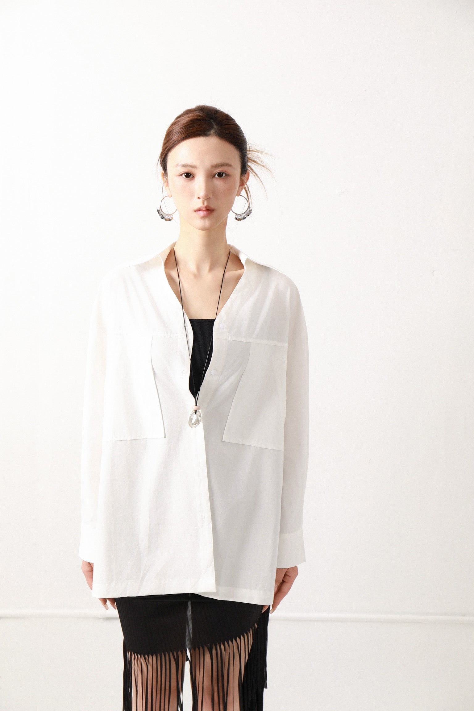 The V-neck collar gracefully frames the face and elongates the neckline, creating a flattering silhouette that enhances your natural proportions. Cut from a featherlight cotton-blend fabric with a subtle luster, the shirt offers a cloud-like softness against the skin while resisting wrinkles for all-day wearability.